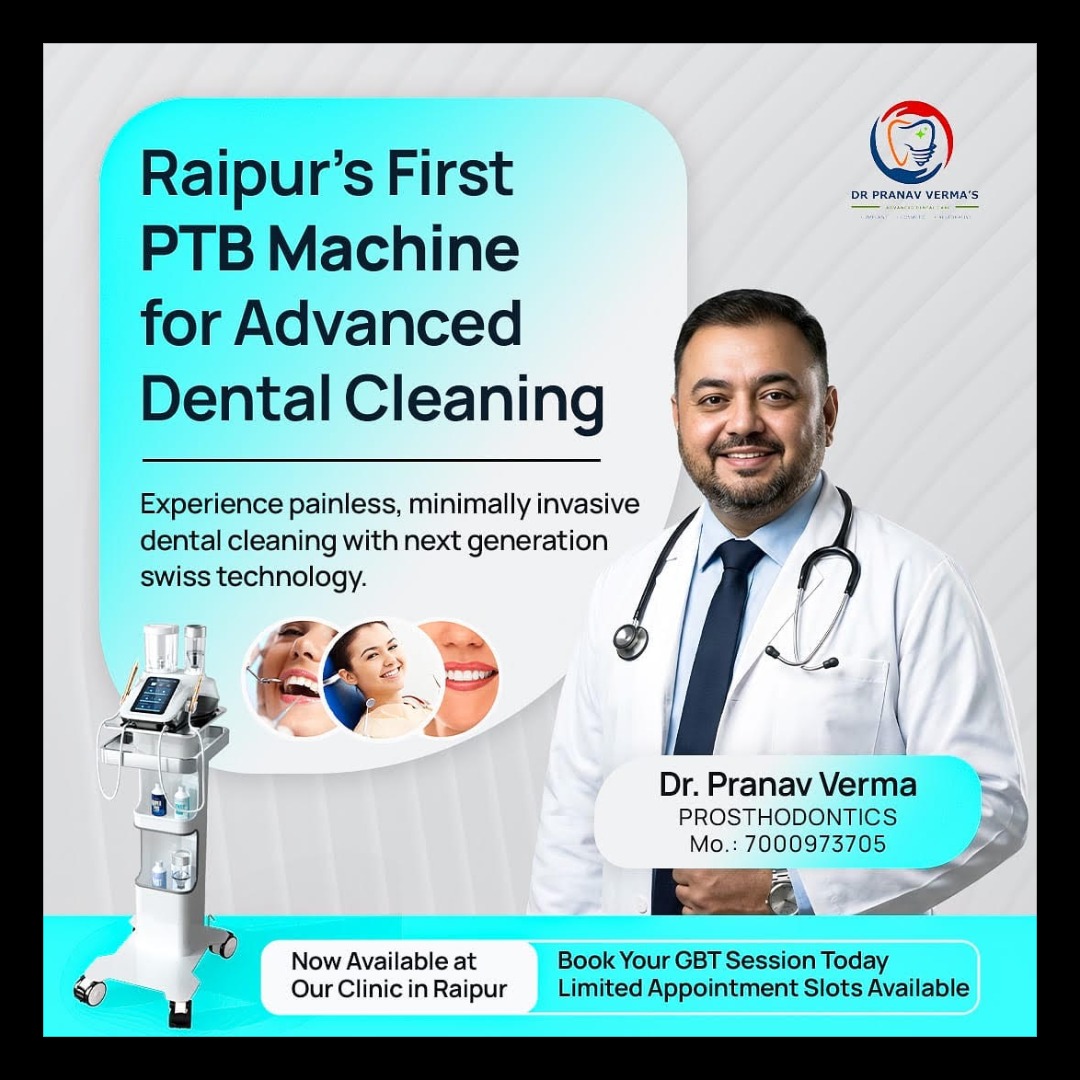 We are proud to announce that our clinic is the FIRST in Raipur to install the advanced PTB (Guided Biofilm Therapy) machine — setting a new benchmark in modern, painless, and highly effective dental care. 🦷 What is GBT (Guided Biofilm Therapy)? Guided Biofilm Therapy is a revolutionary, Swiss-based technology that focuses on removal of harmful biofilm (bacteria) from teeth, gums, and implants in a minimally invasive and comfortable way. Unlike traditional cleaning methods, GBT is: ✔ Scientifically guided ✔ Pain-free and gentle ✔ Highly precise and efficient 🌟 Why PTB / GBT is a Game-Changer? 🔹 100% Pain-Free Experience Say goodbye to the discomfort of traditional scaling. GBT uses warm water and fine powder for a soothing experience. 🔹 Early Detection with Disclosing Special dyes highlight hidden plaque and bacteria, ensuring targeted and complete cleaning. 🔹 Safe for Teeth, Gums & Implants No damage to enamel or restorations—ideal for implants, braces, crowns, and veneers. 🔹 Superior Gum Health Effectively treats and prevents bleeding gums, gingivitis, and periodontitis. 🔹 Perfect for Sensitive Patients Best suited for patients who fear dental procedures or have sensitivity issues. 🔹 Stain Removal & Instant Freshness Removes stains caused by tea, coffee, and smoking—giving you a brighter, cleaner smile instantly. 💡 Why Choose Us? Being the first clinic in Raipur to bring this cutting-edge PTB technology, we are committed to: ✔ Providing world-class dental care ✔ Using the latest innovations ✔ Ensuring maximum patient comfort 😊 Experience the Future of Dental Cleaning Today Upgrade from traditional scaling to GBT – the most advanced, safe, and comfortable cleaning therapy available today. 📍 Visit us and feel the difference yourself!